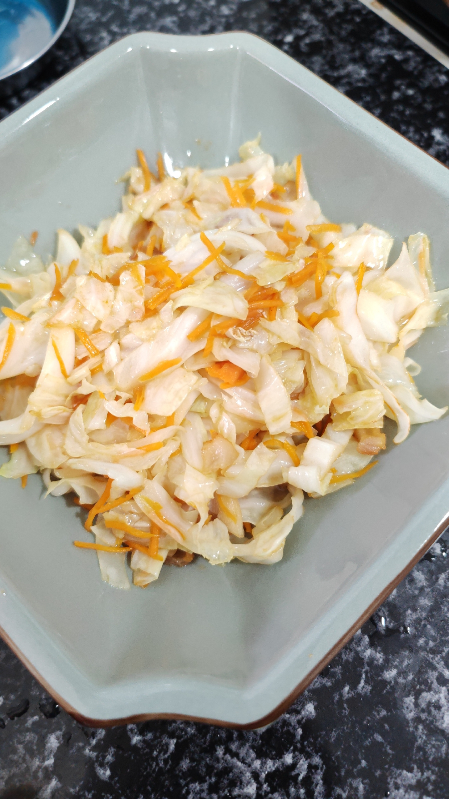 开完会,1点35分了还没吃午餐,赶紧进厨房开炉大火快速的炒好包菜,再炒个臭豆虾。